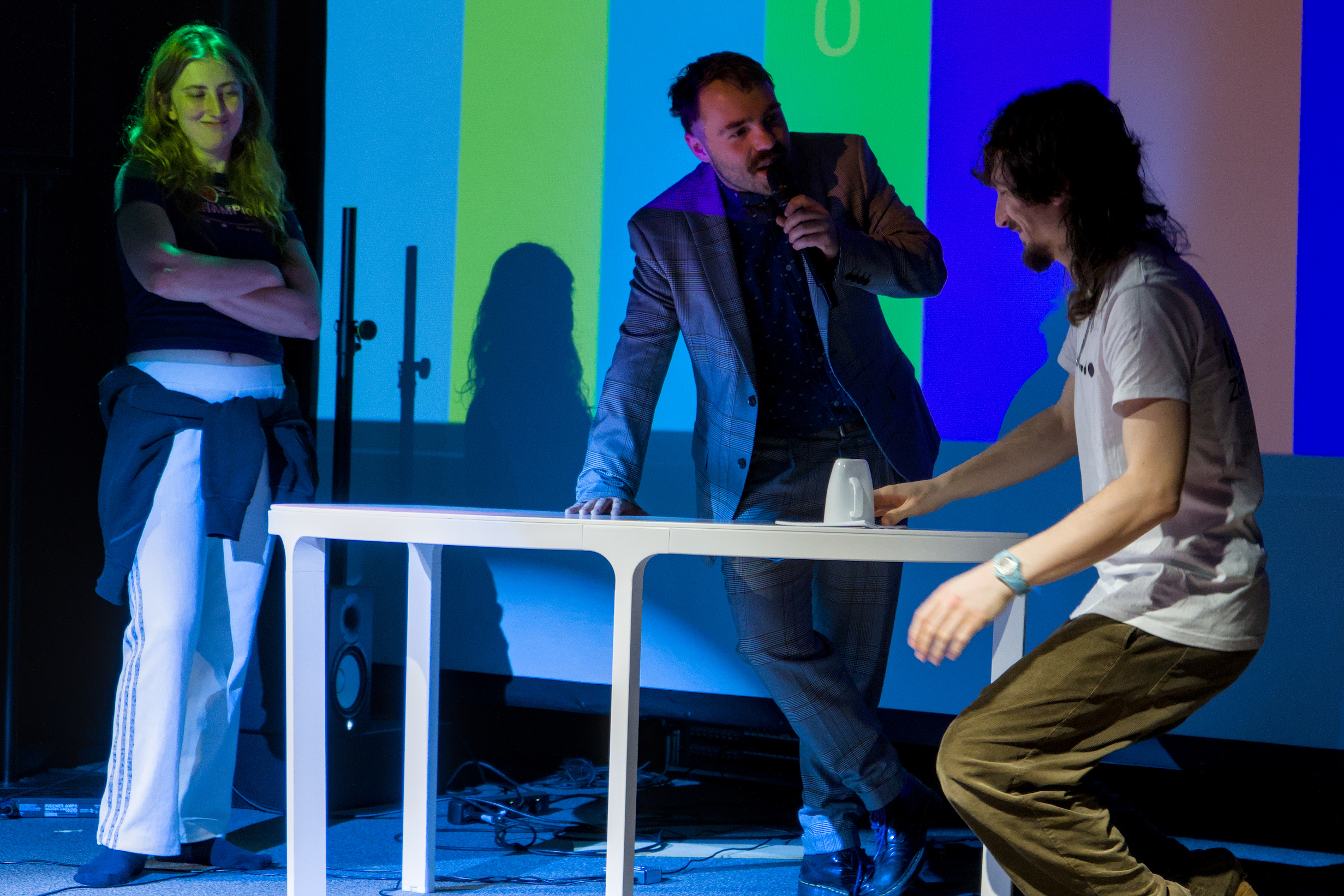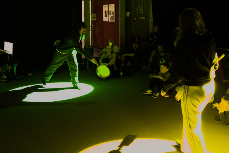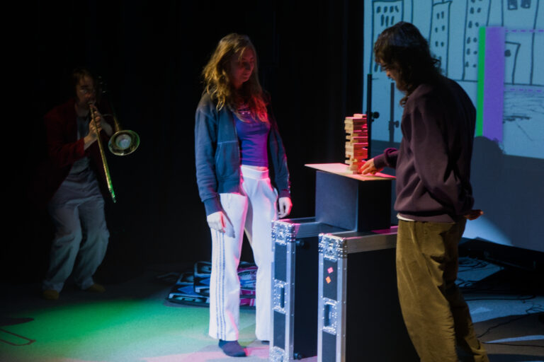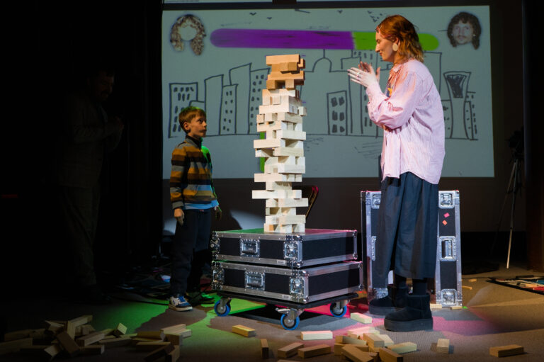 Im Spiel Timbrr (Jenga) wird ein Turm aus Holzklötzchen auf einem Lautsprecher platziert. Zwei Spieler:innen versuchen Holzklötzchen herauszuziehen, ohne den Turm zum Einsturz zu bringen. Dies wird dadurch erschwert, dass eine zunehmende Summe aus Klängen zum Lautsprecher gesendet wird. Durch die gezielte Wahl von Artikulation und Dichte wird die physische Wirkung des Lautsprechers auf den Turm deutlich. Das Publikum kann über Einzahlungen laute Klänge auslösen oder zusätzliche Eingriffe (z.B. Bassverstärkung) aktivieren, wodurch Parameter wie Dynamik und Materialdichte unmittelbar erfahrbar werden.