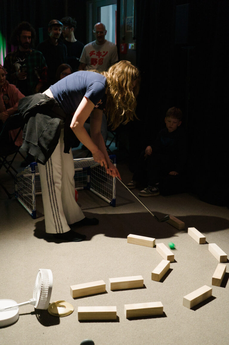 Das Spiel Golf nutzt kamerabasiertes Tracking des Balls, dessen Bewegung direkt mit der Dauer musikalischer Solopassagen verknüpft ist. Während der Ball rollt, werden improvisatorische Linien ausgelöst, die sich in eine begleitende Struktur einfügen. Publikumseingriffe erfolgen über Ventilatoren, welche den Ball wegblasen. Dadurch wird gezielt Einfluss auf Bewegungsverläufe und damit auf musikalische Phrasenbildung genommen.